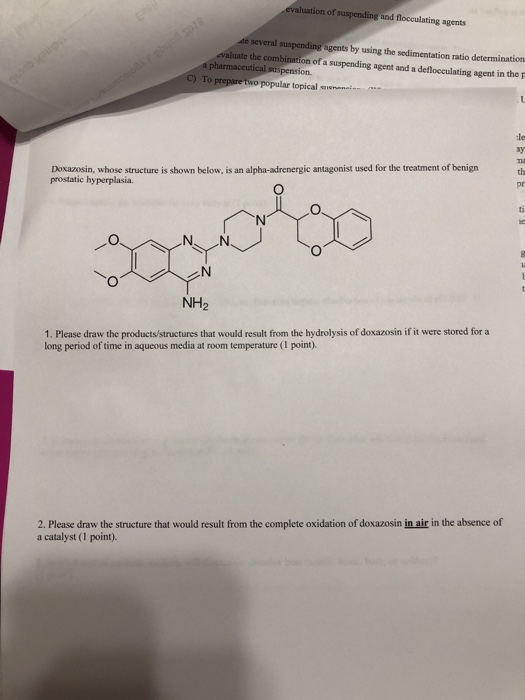 Doxazosin helps reduce the symptoms of an enlarged prostate gland by relaxing the muscle. Read about the chemical and physical properties of doxazosin. Doxazosin mesylate is freely soluble in dimethylsulfoxide, soluble in dimethylformamide, slightly soluble in methanol, ethanol, and water and very slightly soluble in acetone and methylene chloride. Doxazosin is a member of the class of quinazolines that is quinazoline substituted by an amino when you are viewing large structures, like proteins, it can be useful to hide a certain part using fog.